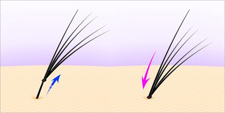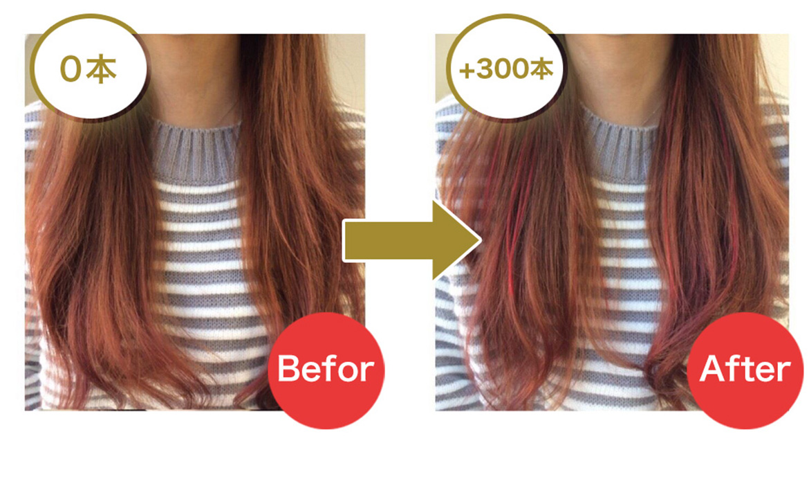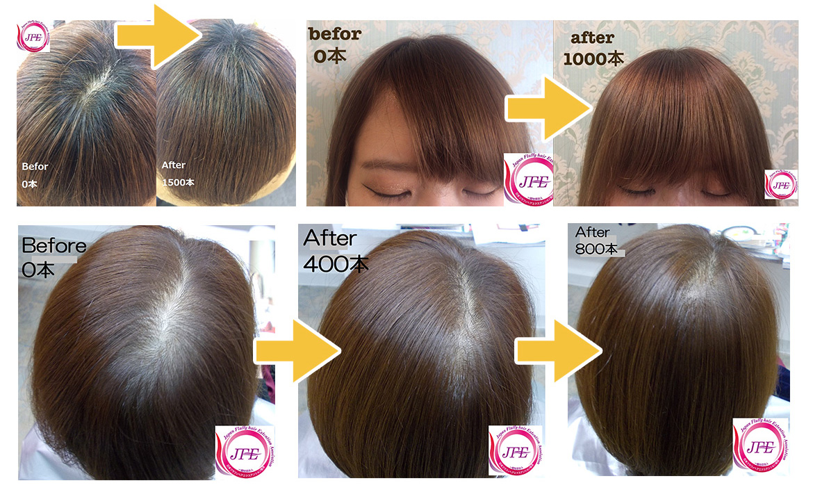 接着剤などは使わず、1本の自分の髪の毛に人工毛を結んでいく増毛技術です。