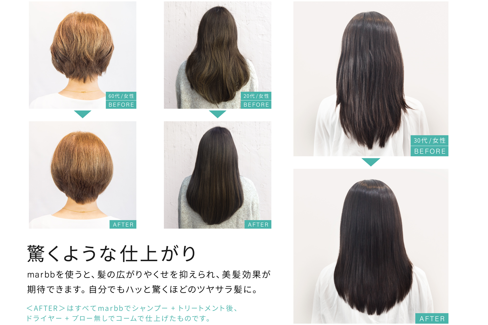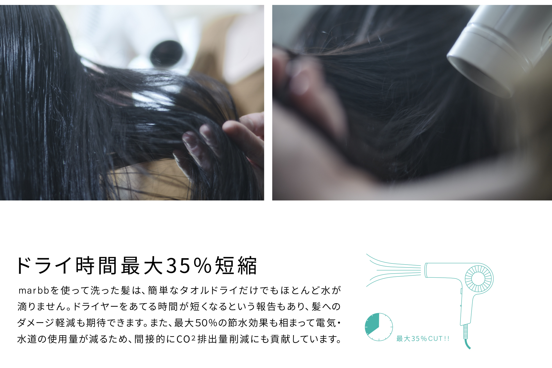 marbbを使って洗った髪は、簡単なタオルドライだけでもほとんど水が滴りません。ドライ時間が最大35%短縮となる報告もあり、作業時短によって接客などに時間を活用することが可能になります。 また、ドライヤーをあてる時間が減らせる分、髪へのダメージ軽減も期待できます。 グラフは、水道水とmarbb製ナノバブル水に髪を浸したときに、どのくらい髪が膨らんだか(膨潤率)を表しています。marbbは水道水と比較して膨潤率が約17%低いことがわかります(自社調べ)。 髪への水分の吸収が抑えられる分、乾燥時間を短くできるのです。