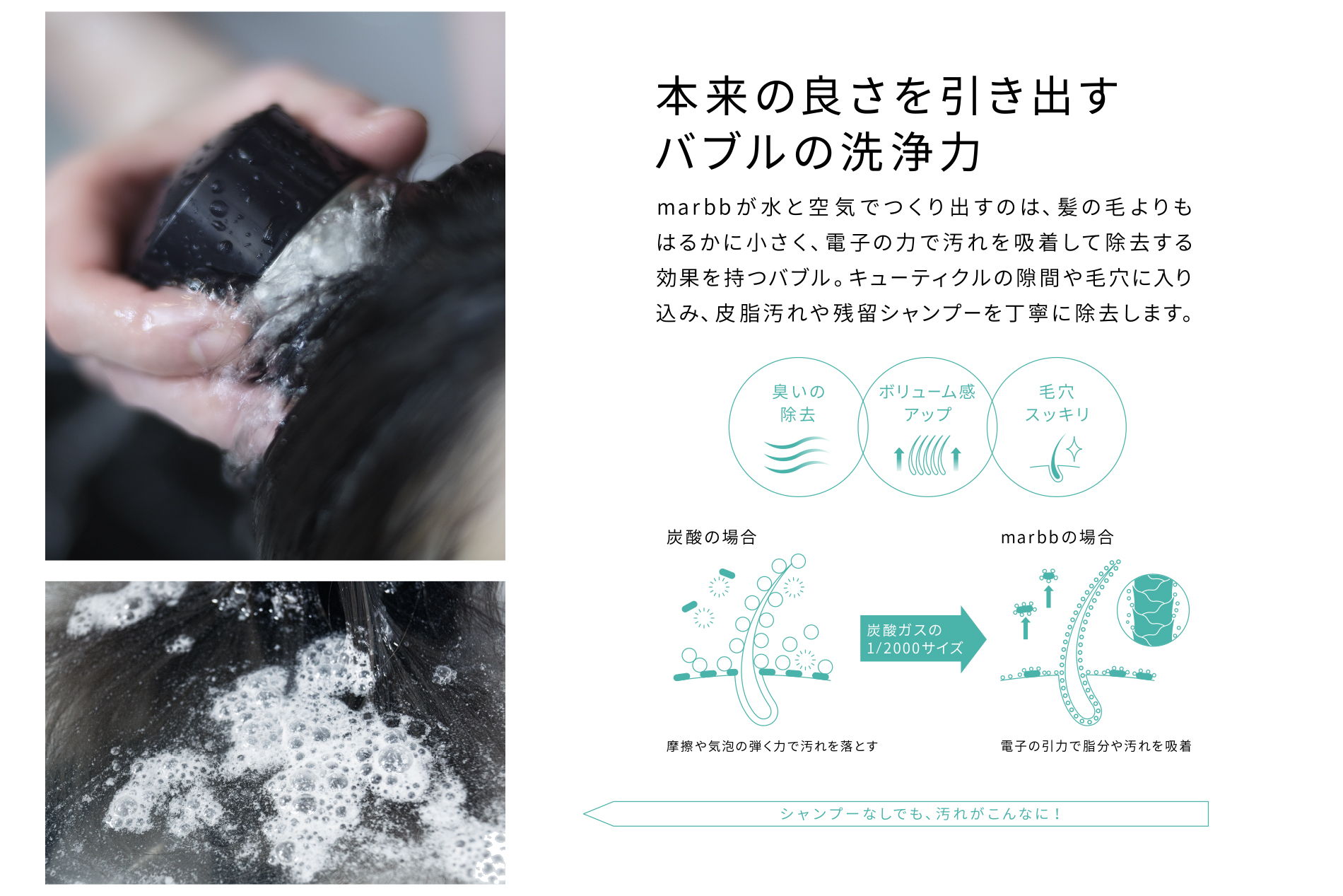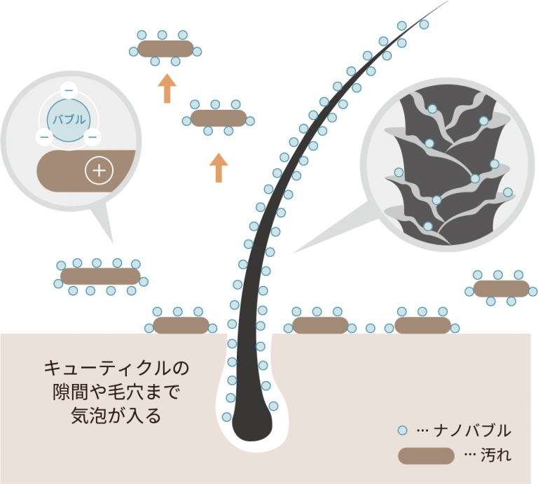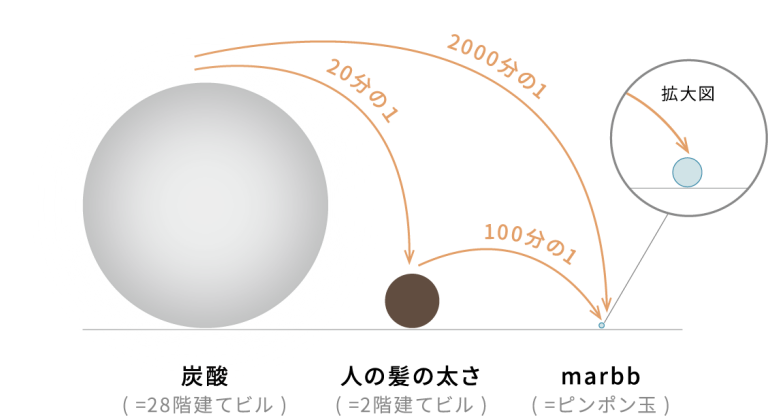 図のように、marbbのナノバブルは最小径0.5μm (マイクロメートル) という、 炭酸の約1/2000のサイズの超微細な気泡です。