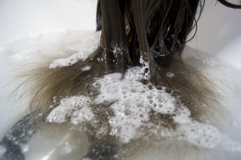 写真はmarbbで発生させたナノバブル水を流すだけで落とせた汚れです。 頭皮にしっかり塗るグレーカラーの後にお使いいただくと真っ白に近いレベルまで頭皮に付着したカラー剤を落とすことができます。